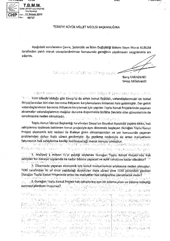 Durağan TOKİ ile ilgili CHP Milletvekili Barış KARADENİZ Meclise soru önergesi verdi. Karadeniz önergesinde artan konut fiyatlarına dikkat çekerek; “Tüm ülkede olduğu gibi Sinop’ta da artan konut fiyatları, vatandaşlarımızın en temel ihtiyaçlarından biri olan barınma ihtiyacını karşılamalarını imkansız hale getirmiştir. Dar gelirli vatandaşlarımızın barınma ihtiyacı karşılamak için yapılan Toplu Konut Projelerinde yaşanan aksamalar vatandaşlarımızı mağdur duruma düşürmekle birlikte Devlete olan güveninde sarsılmasına neden olmaktadır” dedi.